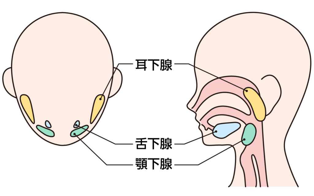 唾液腺には「大唾液腺」と「小唾液腺」の2つがあります。大唾液腺は、耳の下あたりにある耳下腺、舌の根元にある舌下腺、あごの付け根にある顎下腺の3つの腺を指します。小唾液腺は、舌や口内の粘膜にあるたくさんの小さな唾液腺をいいます。