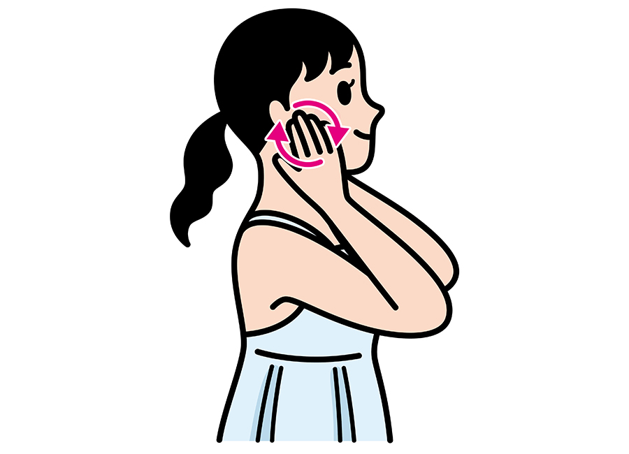 耳たぶの前の下、あごの付け根部分に指を当て、やさしく円を描くように押し回す。