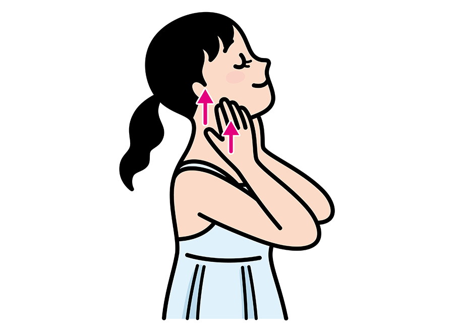 耳たぶと頬の間に指4本を当て、上にやさしく押す。親指はアゴの骨の下に当て、弱く刺激する。
