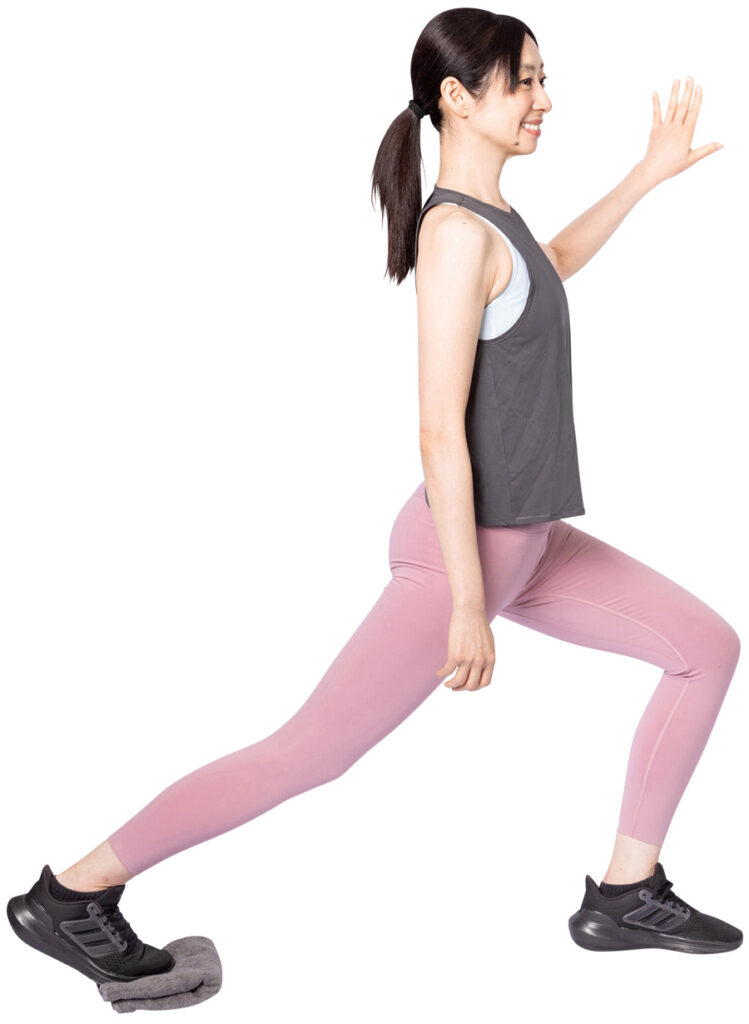 1.壁の横に立ち、左手を壁に添える。右足はタオルの上にのせ、後ろに引きながら左ヒザが90度に曲がるまで体を沈める。