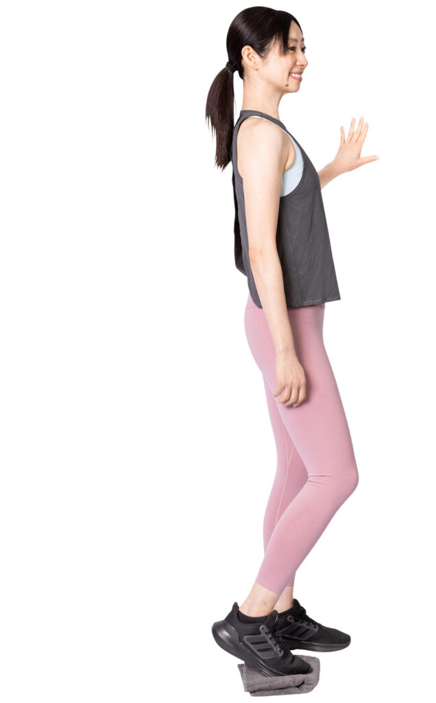 2.右足をタオルごと左足に引き寄せながら、左ヒザを伸ばして立ち上がる。