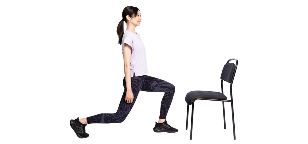 1.椅子の前に立ち、右脚を大きく後ろに引く。左ヒザは90度に曲げ、腰を落とす。