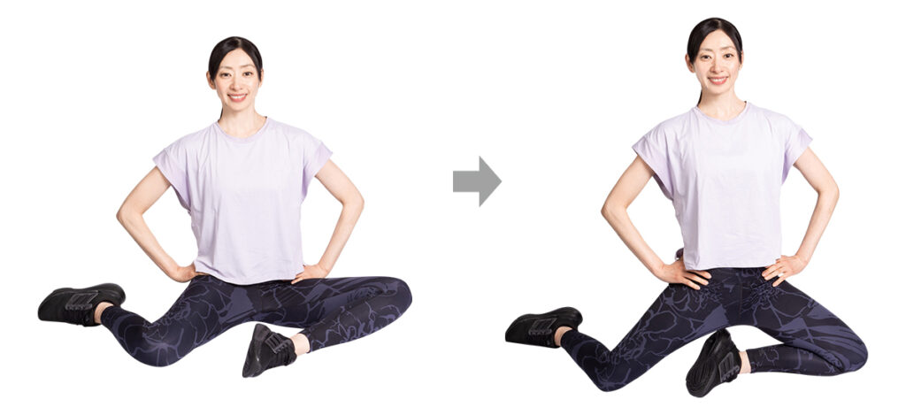 股関節の回旋の動きをチェックして、股関節に適当な柔軟性があるかを確認しましょう。ふらついたりしてスムーズにできない場合、股関節の柔軟性が不足して可動域が狭くなっている可能性があるので、トレーニングを行なって股関節を整えましょう。
