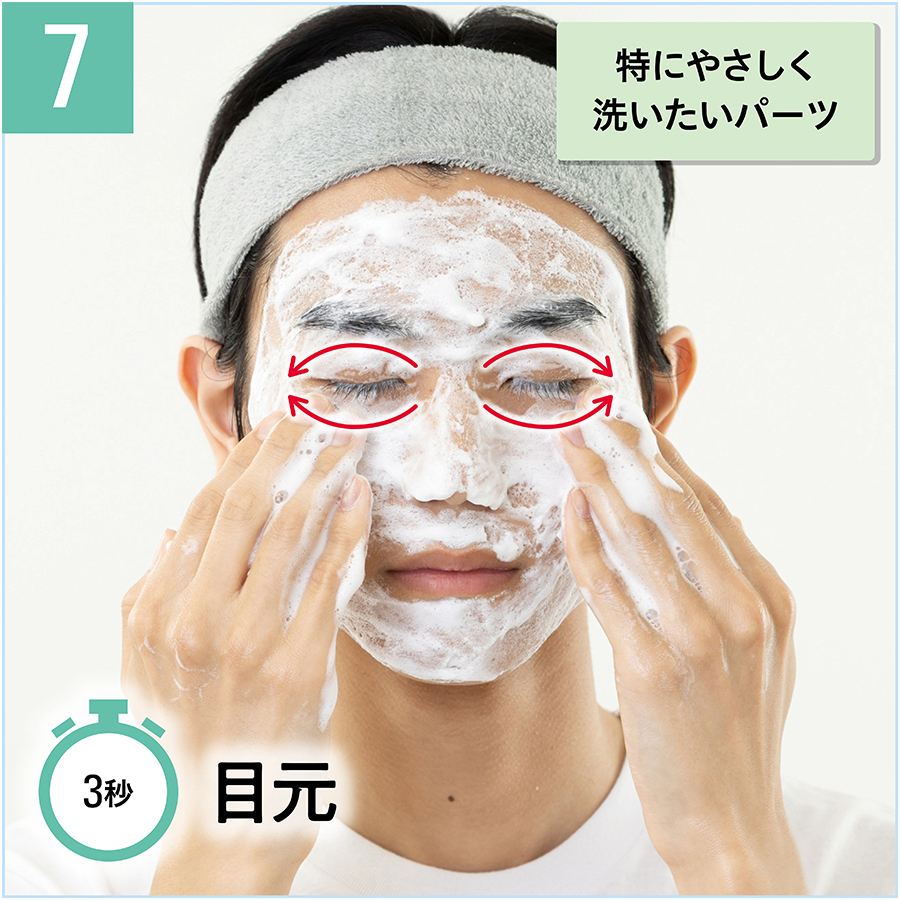 目元は皮膚が薄いため、ほかの部分よりも指の力をさらに抜いて洗いましょう。残った泡で、目頭から目尻に向かってやさしくなでるように行ないます。