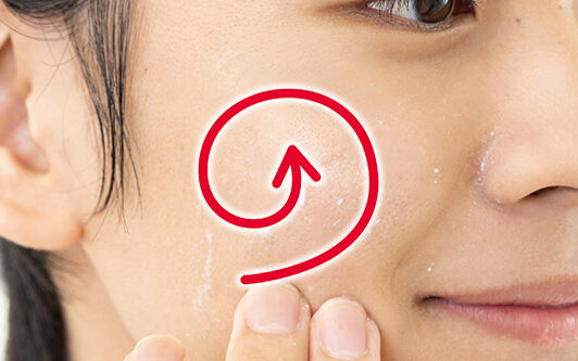 皮脂が気になる額はクルクルと小さい円を、頬は大きい円を描くように指を動かします。ザラつきやテカリが気になる部分は力を入れずやさしく念入りに。