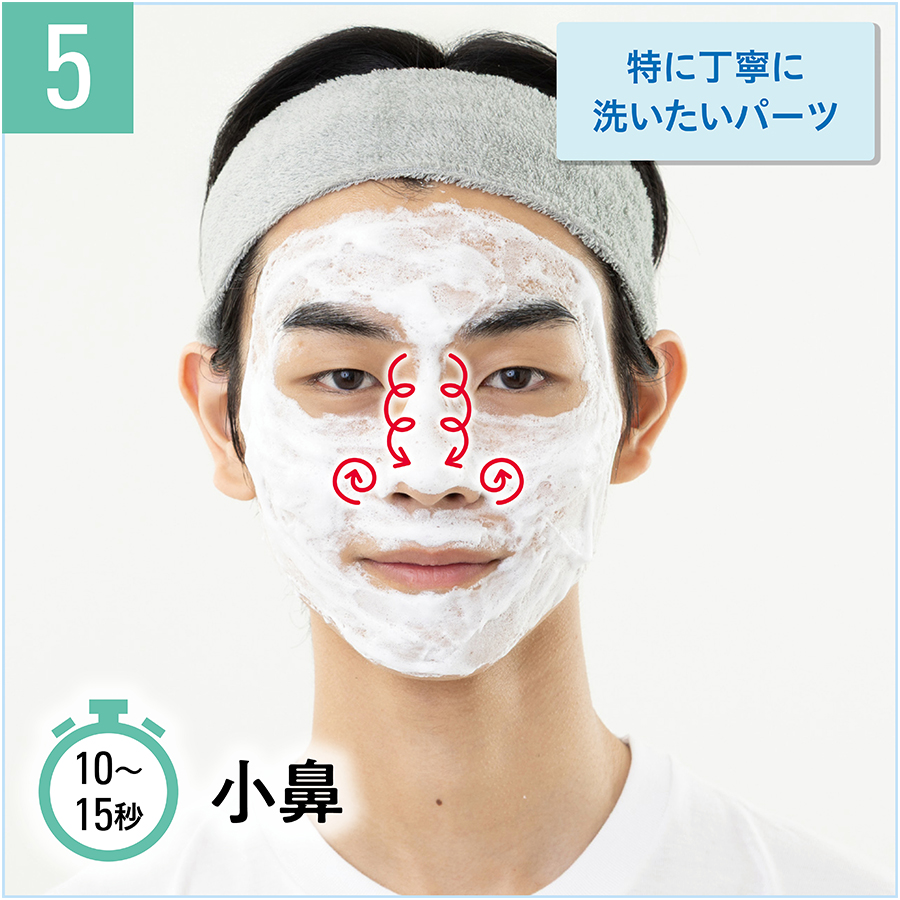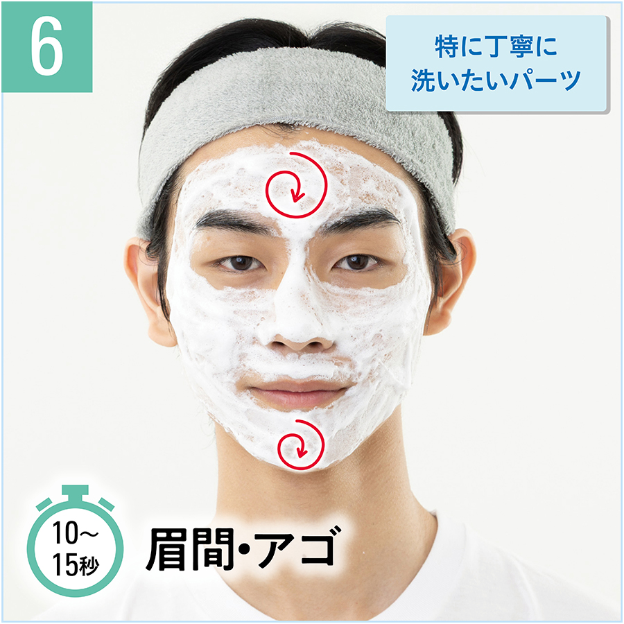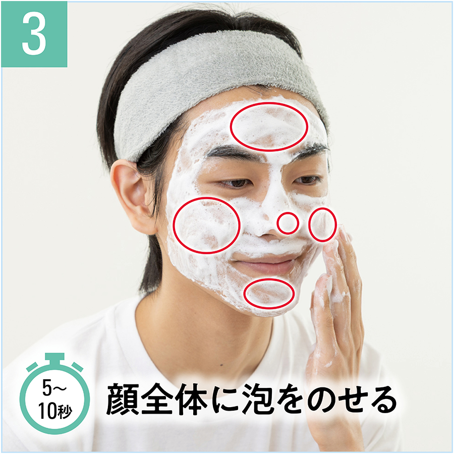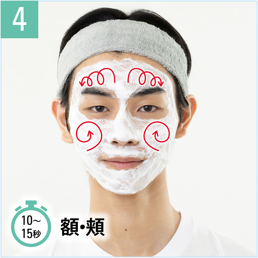 泡を潰さないように額・鼻・アゴ・両頬にのせて全体にのばします。洗浄力をアップさせるため、先に皮脂の多い部分からのせ、皮膚が薄くデリケートな目元は避けましょう。