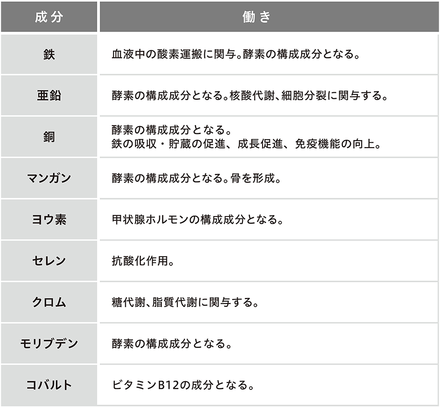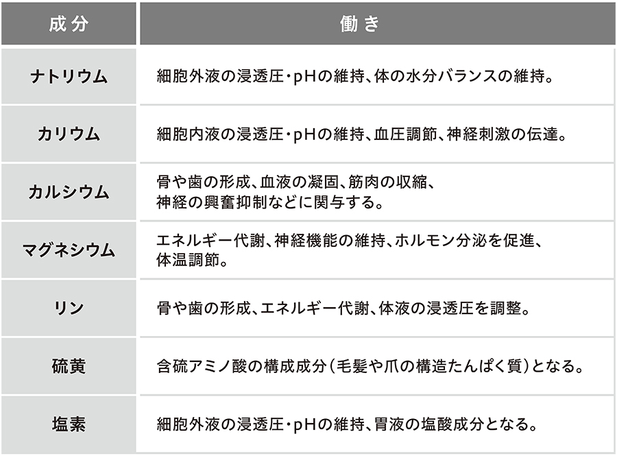 ミネラルは骨や歯などをはじめ、さまざまな体の構成材料になるほか、体液のpHバランスや浸透圧の調整、神経に働きかけるなど、生命機能の調整を行なう役割もあります。ミネラルの種類によって働きが異なるため、偏りなく摂取することが大切です。